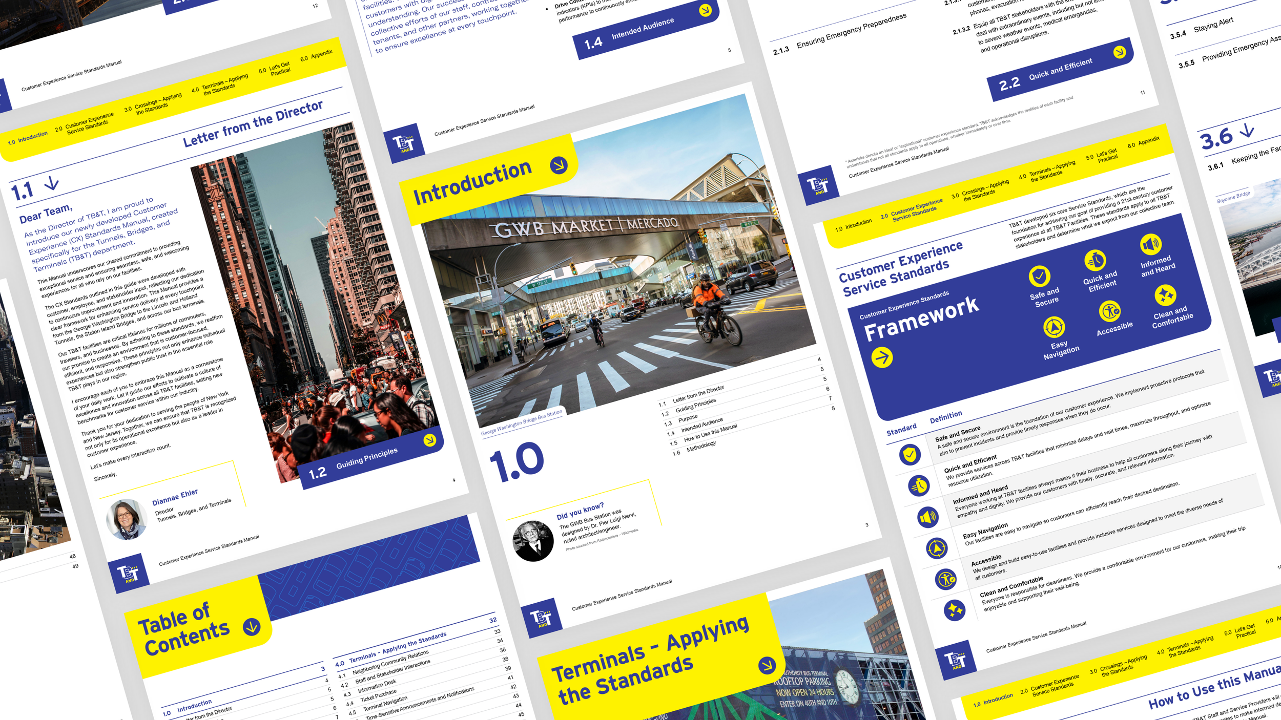 As part of an effort to bring a 21st-century customer experience (CX) to Port Authority’s Tunnels, Bridges, and Terminals (TB&T) department, JK helped develop a CX manual to set the right tone—and create consistent service standards—across all TB&T facilities. The manual is the catalyst for a larger mindset shift around customer service standards. So we focused on making it easy-to-use and rooted in a recognizable visual language that resonates with our audiences.